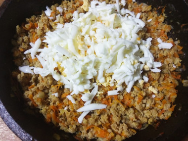 Когда вся влага из сковороды испарится, фарш готов. В одном рецепте видела вариант, когда в горячий готовый фарш добавляют не вареное, а сырое яйцо и быстро перемешивают. Яйцо быстро приобретает консистенцию омлета. Так начинка получается нежнее.