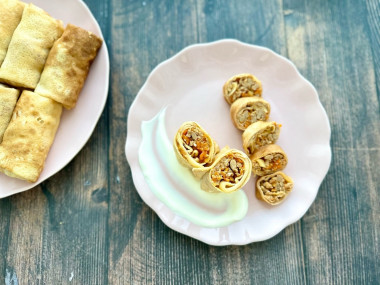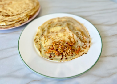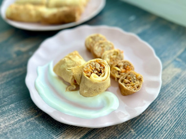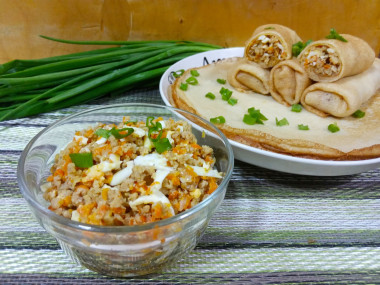 Начинка для блинов готова. Осталось испечь блинчики, завернуть в них мясную начинку и подать к столу. Приятного аппетита!