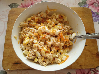 Использовала покупной куриный фарш. Обжарила овощи отдельно, я к моркови все таки добавила ещё и луковицу. Потом пережарила вместе с фаршем. Из специй положила соль и перец. Отваренные вкрутую яйца порезала кубиками. Всё соединила и мясная начинка готова. Несложно, быстро и вкусно. Начинка по этому рецепту сытная, сочная, ароматная и невероятно вкусная. Я попробовала готовую начинку и съела бы ее просто так))) но родным обещала пирожки, поэтому вовремя остановилась.