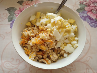 Яйцо предварительно отварите вкрутую. Как сварить яйца вкрутую? Чтобы яйца при варке не треснули, положите их в холодную воду и поставьте варить на небольшой огонь. Варите яйца 9 минут после закипания, затем залейте холодной водой и остудите. От резкого перепада температур скорлупа лучше очистится. Очищенное яйцо мелко порубите. Для большей однородности начинки яйцо можно натереть на крупной терке. Тут решайте сами, как вам больше нравится.