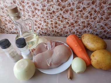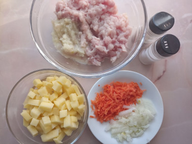 Как сварить картофельный суп с фрикадельками? Подготовьте указанные ингредиенты. Фарш у меня домашний из индейки и свинины, вы можете взять любой на свой вкус. В нем у меня уже есть лук и чеснок, если будете использовать фарш из магазина, то добавьте в него мелко нарезанные лук и чеснок. Также понадобится 1,5 - 2 л воды или бульона.