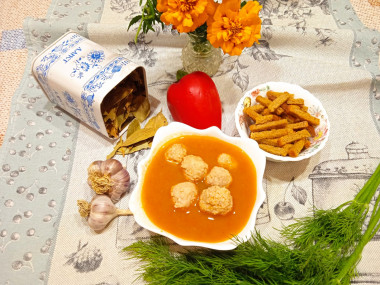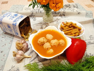 Рецепт подкупил своей простотой и доступными продуктами. Отличный получился супчик, ароматный, не тяжелый, но сытный одновременно. Фарш я взяла куриный и добавила в него чеснок. Единственное отступление от рецепта - мы решили сделать суп-пюре. Получилась нежная, кремовая консистенция, за счет чеснока ещё и с особенным ароматом.