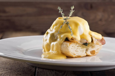 На бекон положите яйцо-пашот. Полейте все это голландским соусом. Можете также сверху поперчить и посыпать яйцо рубленой зеленью.