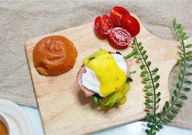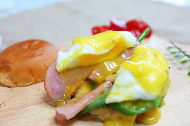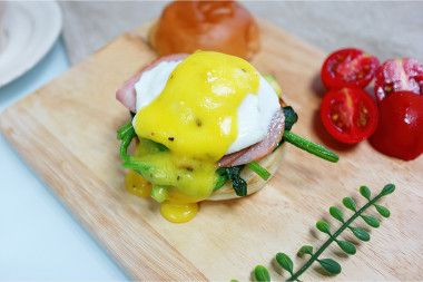 Вместо бекона взяла ветчину, не люблю жирный бекон. Голландский соус мне понравился. Яйцо-пашот я умею готовить, все получилось идеально.