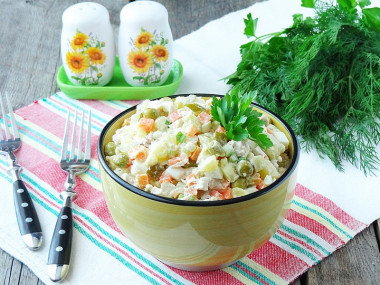 Салат столичный с курицей и солеными огурцами готов. Подавайте его к столу, при желании украсив зеленью. Приятного аппетита!