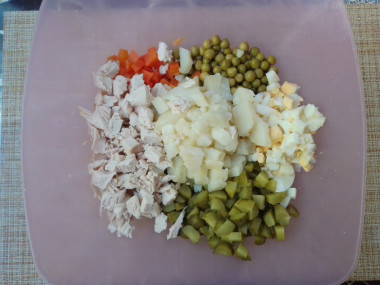 Подала сегодня к столу салат столичный с курицей и солеными огурцами. Это бессмертная классика, которая всем нравится.