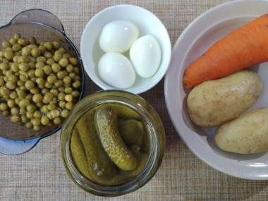 Как сделать салат столичный с курицей и солеными огурцами? Подготовьте все необходимые ингредиенты. Картофель и морковь тщательно помойте и отварите в кожуре до готовности. Они должны с легкостью прокалываться ножом. Овощи остудите и очистите от кожуры. Филе отварите в чуть подсоленной воде в течение примерно 15-20 минут до готовности. Яйца сварите вкрутую. Как правильно это сделать читайте в статье по ссылке в конце рецепта.