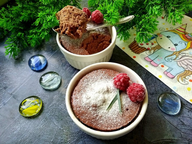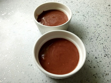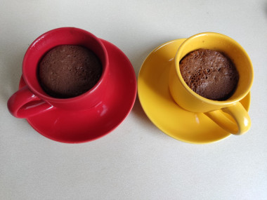 Я сделала две порции, себе и сыну. При замешивании теста оказалось, что муки многовато. Поэтому разбавила тесто чайной ложкой сметаны. Советую добавлять муку небольшими порциями, чтобы не переборщить. Мука у всех разная. Шоколадное тесто разлила по двум керамическим формочкам, получилось примерно до середины. Выпекать решила 1,5 минуты, т. к. мощность моей микроволновки 750 Вт. (не очень много).