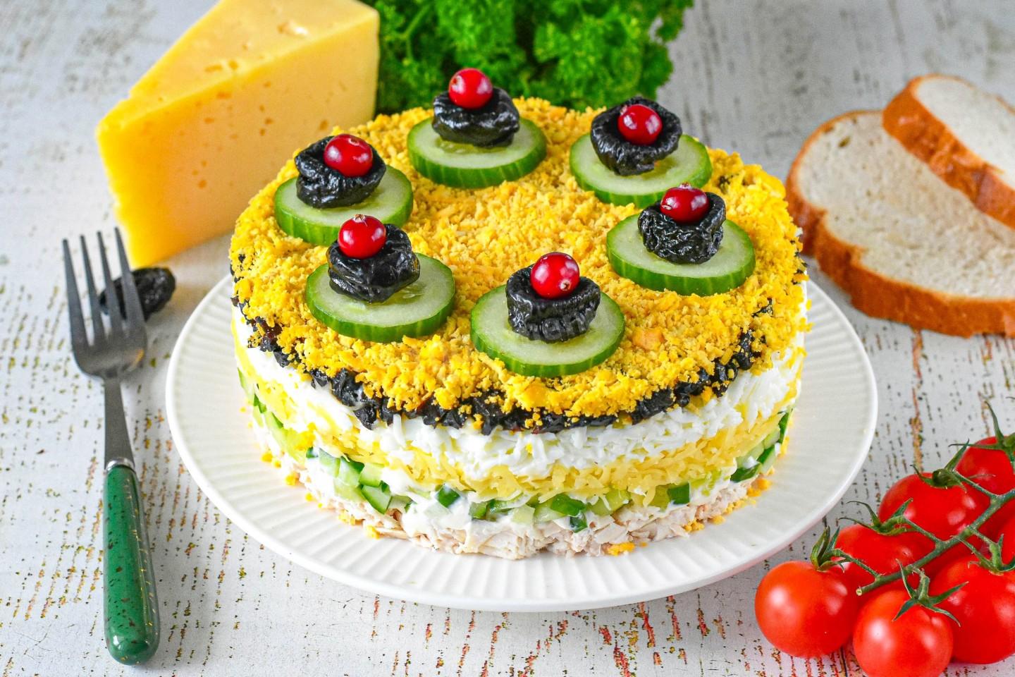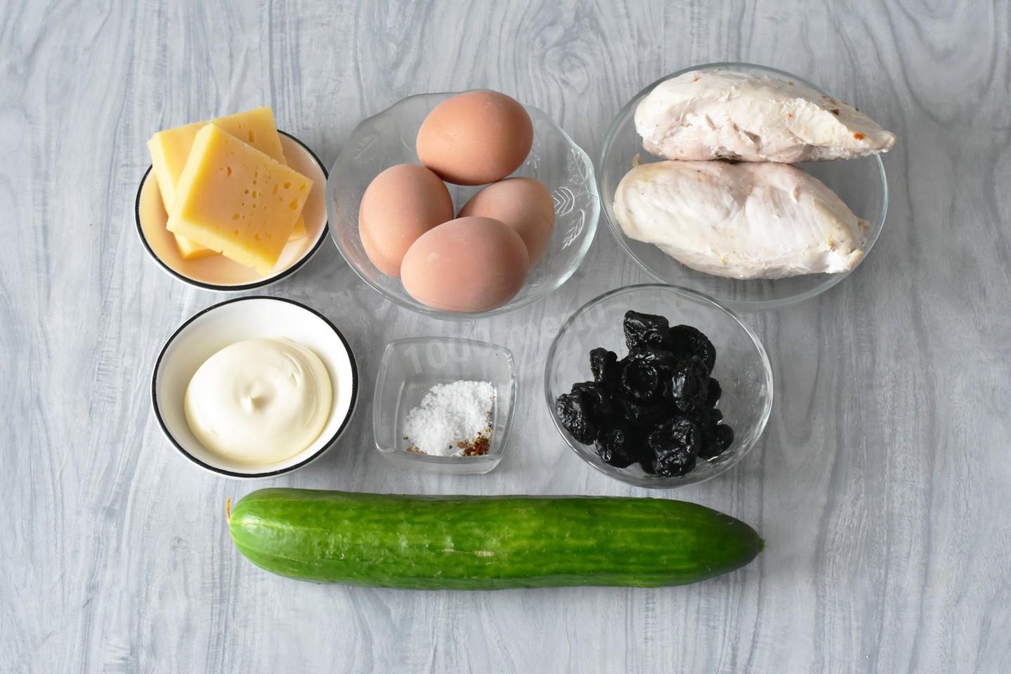 На блюдо установите кулинарное кольцо диаметром 15-16 см) и выложите слоями, промазывая каждый майонезом, запеченное куриное филе, огурцы, тертый сыр, тертые белки, чернослив и тертые желтки. Салат уберите на 1 час в холодильник для пропитки. Чтобы верхний слой не заветрился, накройте форму пищевой пленкой.