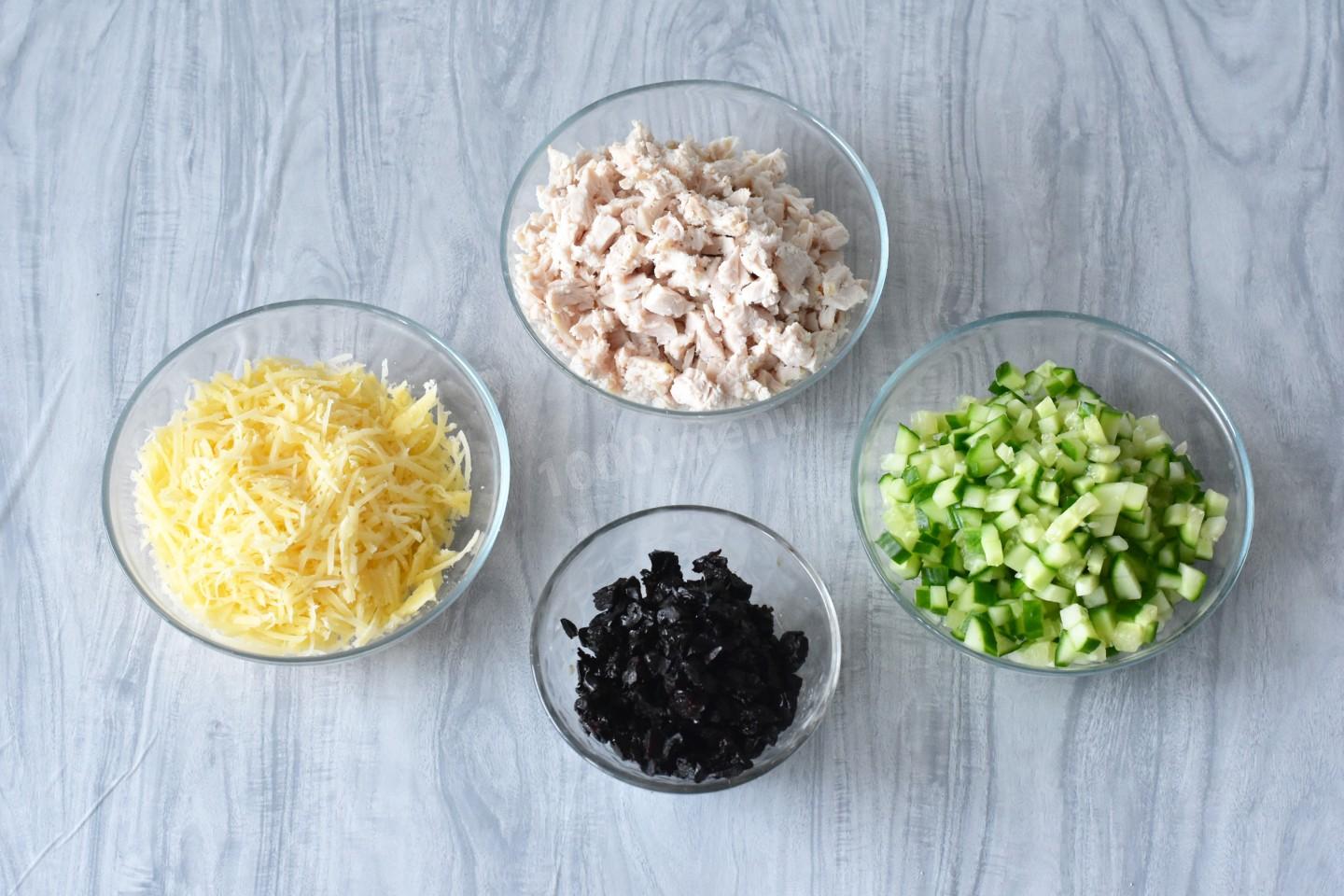 Куриное филе охладите и нарежьте мелкими кубиками. Огурцы вымойте и нарежьте мелкими кубиками. Чернослив вымойте и нарежьте небольшими кусочками. Если чернослив засохший, предварительно его распарьте в горячей воде. Сыр натрите на средней или крупной терке. Сорт сыра можете подбирать по своему вкусу. Важно, чтобы сыр был без заменителей молочных жиров и был вкусным. Как заменять разные виды сыров читайте в статье в конце рецепта.