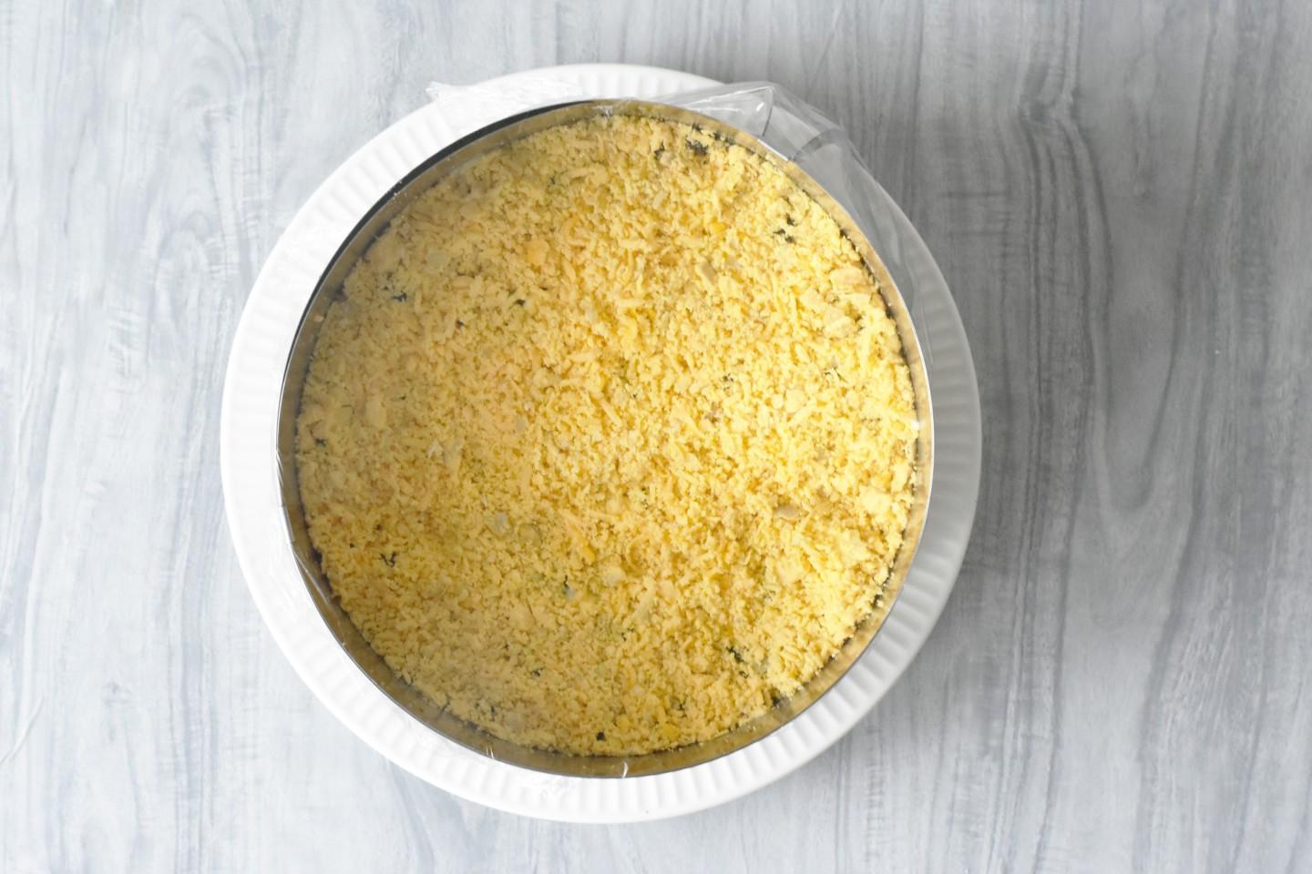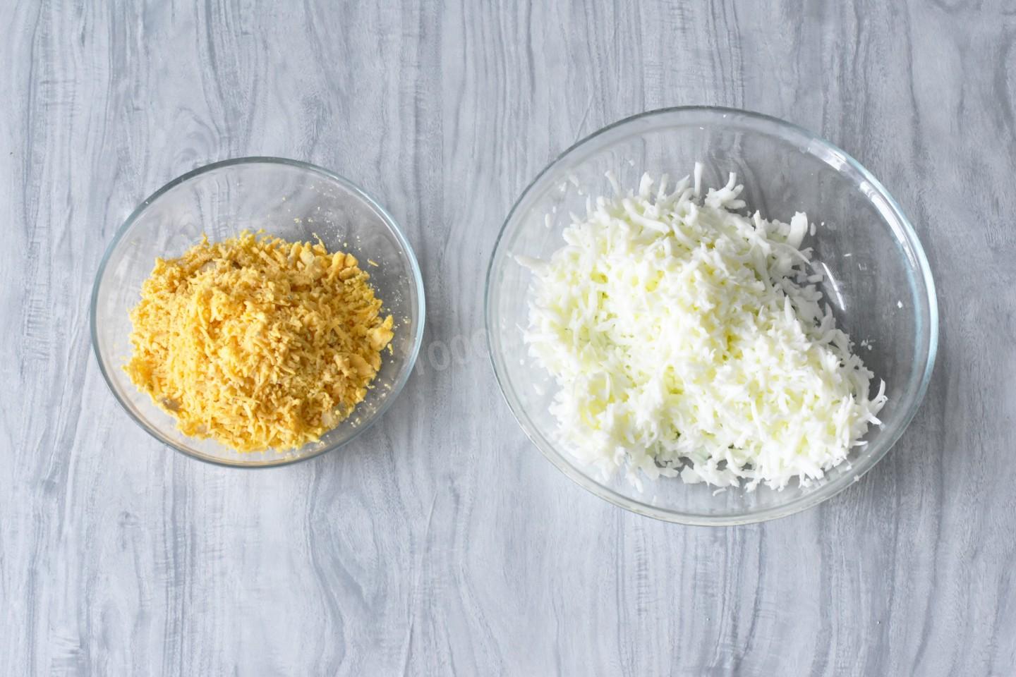 Яйца отварите вкрутую, охладите и очистите. Разделите на белки и желтки. Белки натрите на средней или крупной терке, а желтки - на мелкой. Подробнее о том, как сварить яйца вкрутую и как натирать на терке разные продукты, читайте в статьях по ссылке в конце рецепта.