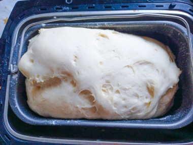 Решила приготовить пончики к чаю. По этому рецепту замесила тесто для пончиков дрожжевое. Вручную я этого делать не стала, воспользовалась хлебопечкой. Ингредиенты отправила в чашу хлебопечки в следующем порядке: молоко, яйцо, растопленное сливочное масло, просеянная мука, сахар, соль, дрожжи. Муки положила 600 граммов, этого количества в моем случае вполне хватило. Включила хлебопечку на режим «Тесто».