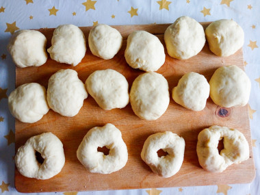 2. Разделите тесто на равные части. Сформируйте из каждой части шарик, накройте пищевой пленкой и оставьте для расстойки примерно на 10 минут. Затем в каждой заготовке руками сделайте отверстие в самом центре.