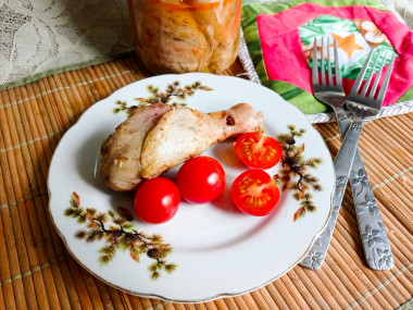 Банку я взяла объемом 800 мл. Все шесть ножек отлично уместились в ней. Кроме обычного перца горошком я положила ещё парочку горошин душистого перца. Готовилась курица в собственном соку у меня 1 час, как и написано в рецепте. Пока курочка запекалась, в квартире витали такие запахи, что слюнки текли.