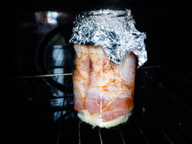 Слегка остывшую банку выньте из духовки, осторожно не обожгитесь!