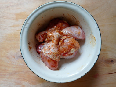 У меня было шесть куриных ножек (общим весом около 800 граммов), их и взяла для этого рецепта. Из специй кроме соли и перца добавила ещё паприку. мариновались ножки у меня около 1,5 часов.