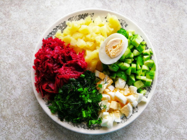 Влейте к овощам охлажденный свекольный отвар. Все аккуратно перемешайте и поставьте в холодильник на 25-30 минут. Попробуйте блюдо на соль и при необходимости досолите. Вместо свекольного отвара можно использовать кефир или смесь кефира со свекольным отваром, тогда получится холодный борщ на кефире