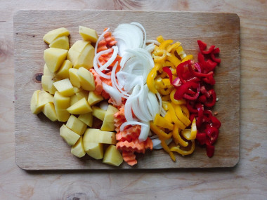 Картофель нарежьте крупными кусочками. Для чего овощи нарезать крупно? Крупная нарезка сохранит максимальный вкус и форму овощей в готовом блюде.