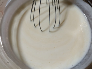 Затем добавьте кефир и все перемешайте. Для этого можно воспользоваться миксером. Я пекла вафли без соли, просто сладкими, но пожеланию для усиления вкуса можно добавить на этом этапе щепотку соли и перемешать.