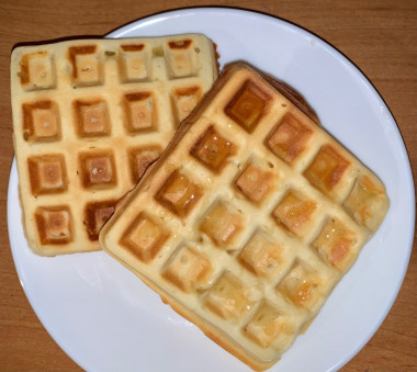 Готовые вафли должны становиться аппетитного золотистого цвета. Этого количества теста хватает на 6 вафель, т.е. на 3 выпекания по две вафли.