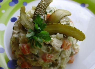 Также в качестве заправки можно использовать не только майонез, но и сметану или натуральный йогурт. Их можно взять по отдельности либо смешать с майонезом в любой пропорции на свой вкус - это снизит калорийность блюда.