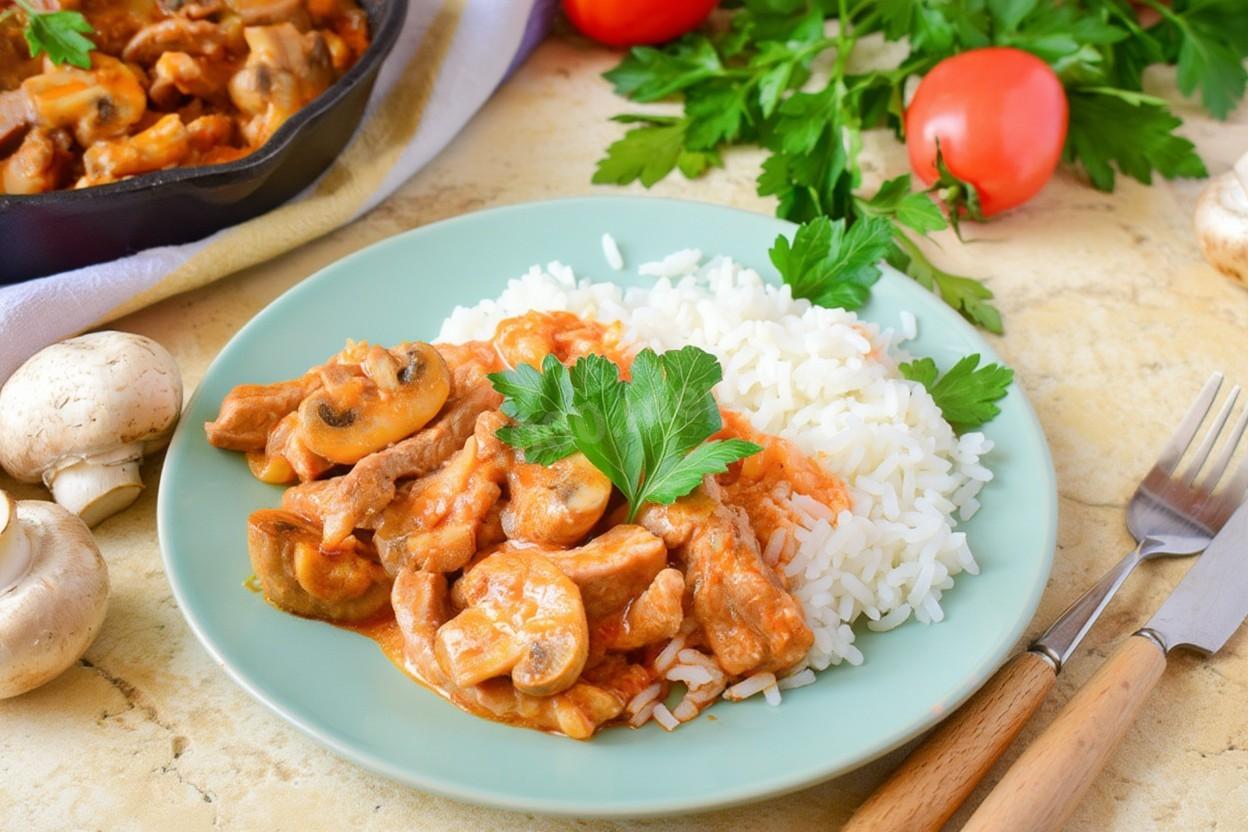 Бефстроганов из свинины с грибами готов! Дополните его гарниром из риса или картофельного пюре. Приятного аппетита!