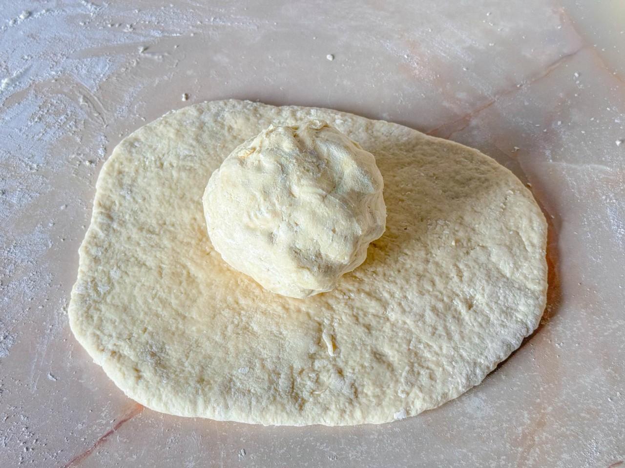 Сложите пласты теста конвертом: сначала соседние края друг к другу, затем внахлёст два других края. Слегка примните конверт руками.