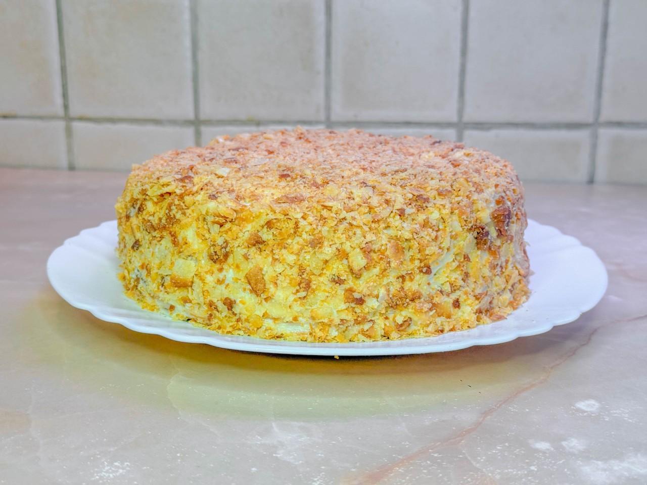 Обсыпьте крошкой бока и вверх торта. Дайте Наполеону как следует пропитаться, для чего поставьте его в холодильник на пару часов (лучше на ночь).