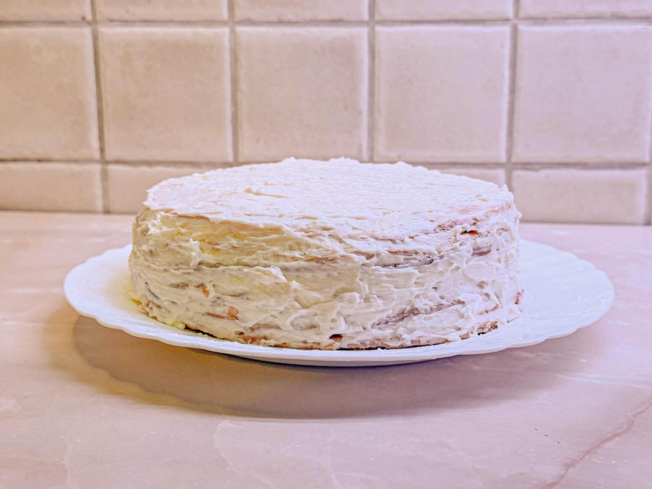Собирайте торт, когда и коржи, и крем полностью остыли, но сам крем еще не успел застыть в холодильнике.