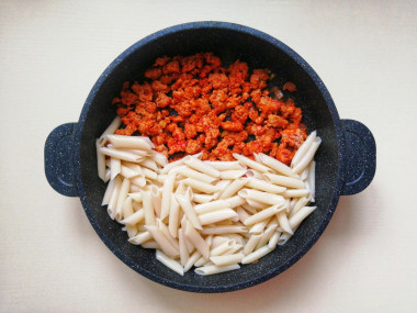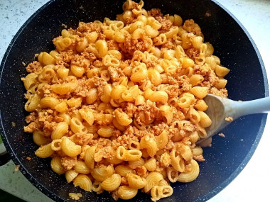 Макароны слегка недоварила, чтобы потом потушить их вместе с сочным фаршем.