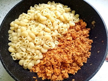 Готовые макароны откинула на дуршлаг, дала стечь воде, затем выложила в сковородку с фаршем, перемешала и дала постоять на огне минуты 3.