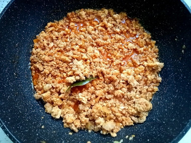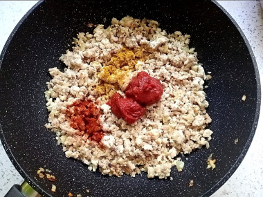 Фарш накрутила из куриной грудки, а для сочности добавила на сковородку немного свиной грудинки, на которой и жарила вместо растительного масла. Добавление томатной пасты в зажарку сделало это блюдо гораздо вкуснее и насыщеннее! Из специй я взяла карри и паприку, а также добавила свежий лавровый листочек для аромата.