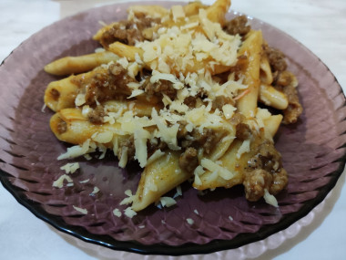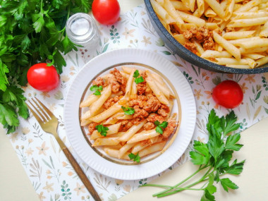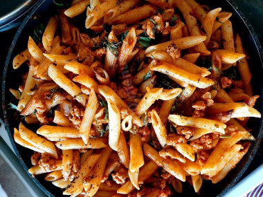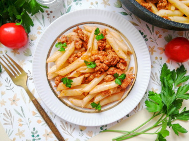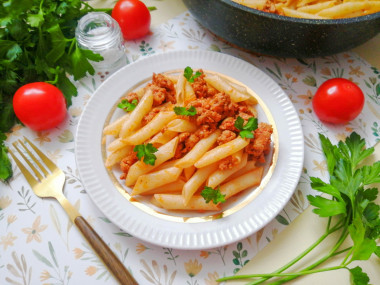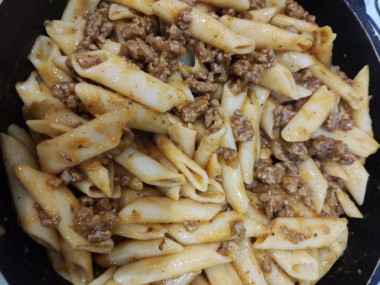 Пока перья варились, обжарила на сковородке свиной фарш с луком и томатной пастой.