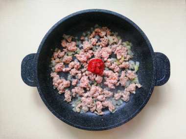 Затем добавьте в сковороду к луку мясной фарш. Помешивая, обжаривайте его 3-5 минут. За это время фарш поменяет цвет. Затем добавьте в сковороду томатную пасту. По вкусу подсыпьте соль и специи.
