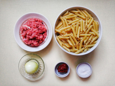 Как сделать макароны с фаршем и томатной пастой на сковороде? Подготовьте для этого необходимые ингредиенты. Фарш можно использовать из любого вида мяса. Это может быть курица, говядина, свинина, индейка... Я буду готовить из свиного фарша. Макароны, так же, могут быть любые - рожки, перья или спагетти. Выбирайте на свой вкус.