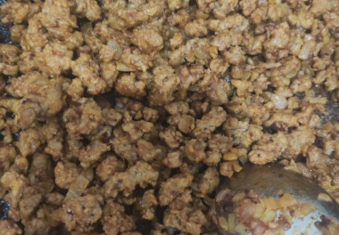 Обжаривайте все вместе еще минут 5. Если фарш сухой, то можно добавить пару столовых ложек воды, чтобы он не подгорел.