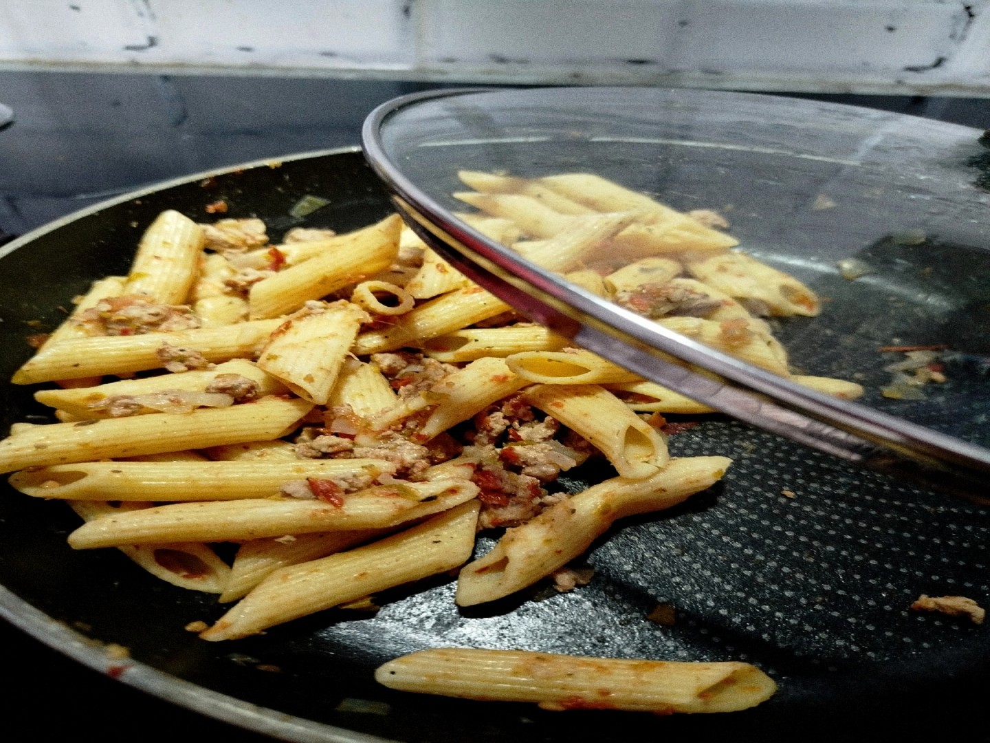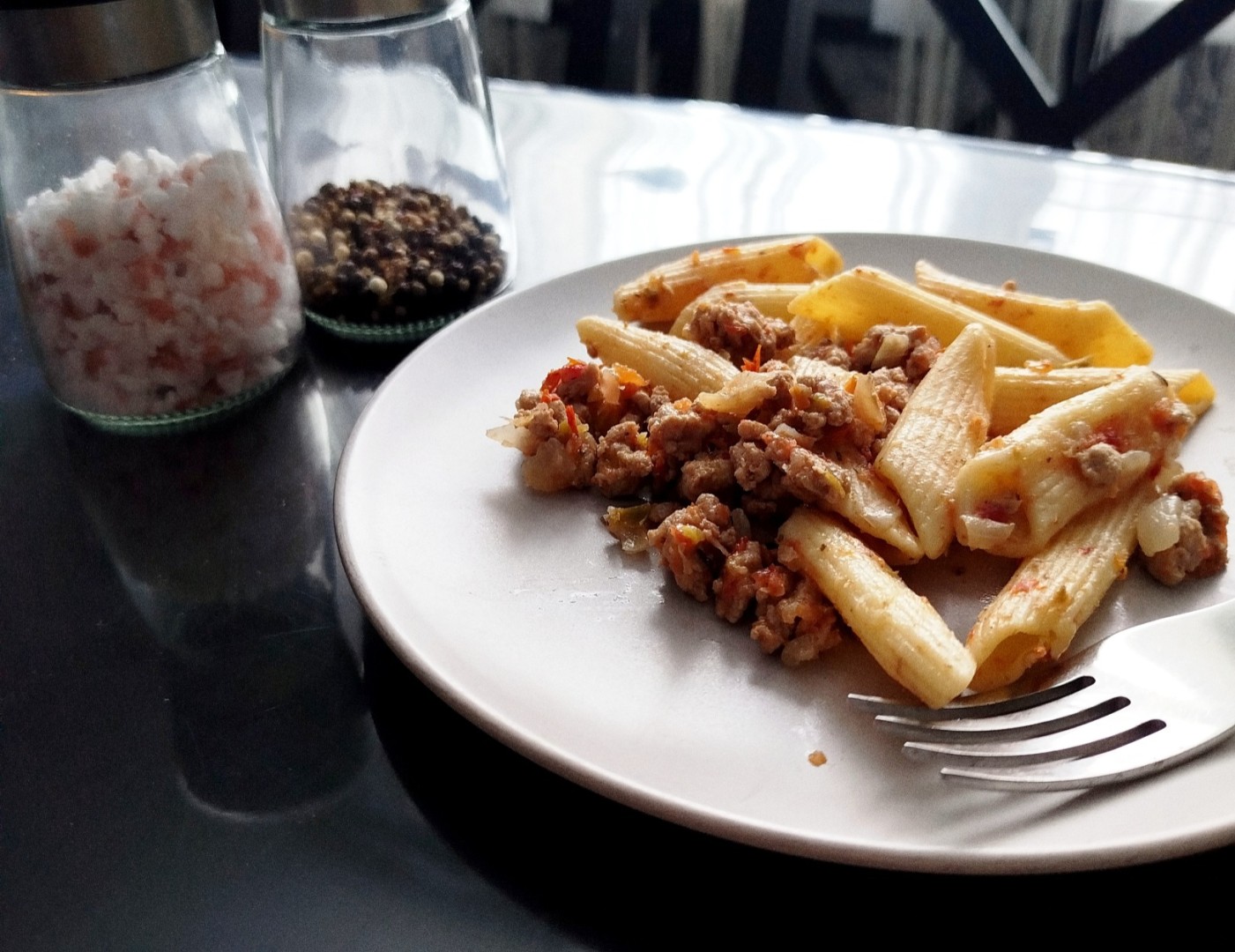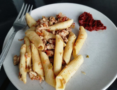 Пока перья варились, обжарила на сковородке свиной фарш с луком и томатной пастой.