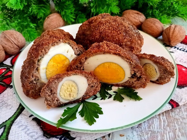 В фарш добавила петрушку и репчатый лук, натертый на терке. Оборачивать им яйца было удобно. А вот желтковая смесь у меня получилась густой, я бы добавила половинку белка для удобства.