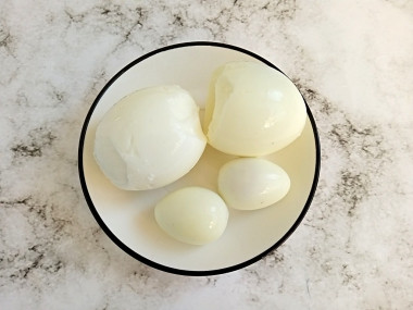 Два оставшихся яйца отварите в течение 9 минут, затем залейте их ледяной водой. Оставьте на пару минут, затем воду слейте. Очистите яйца от скорлупы, от перепада температур она очень легко отойдет.