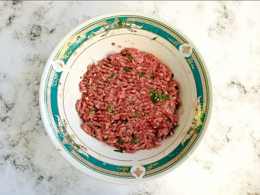 Измельчите укроп и зеленый лук. Отправьте зелень к фаршу. Посолите, поперчите. Если вы используете зеленый лук, то добавьте немного репчатого, натертого на терке. У одного яйца отделите белок от желтка. Желток понадобится чуть позже, белок отправьте к фаршу. Перемешайте.