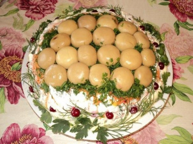 Все сделано по рецепту. Салат Грибная поляна с шампиньонами очень понравился. Собирал салат в разъемной форме. Дно формы и боковую поверхность выложил пергаментом. Пергамент снял после пяти часов пропитки салата в холодильнике.