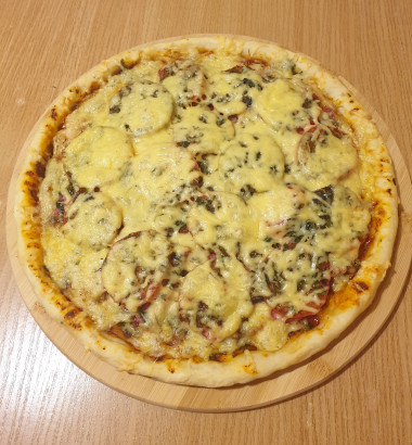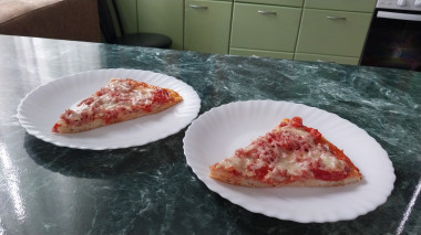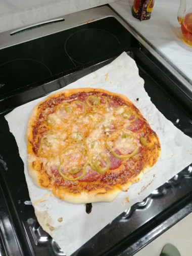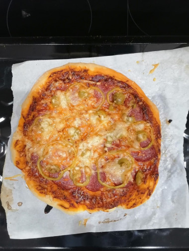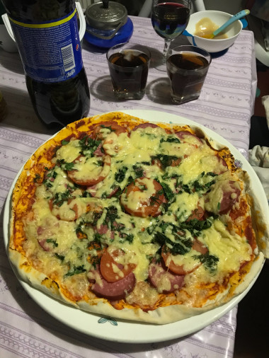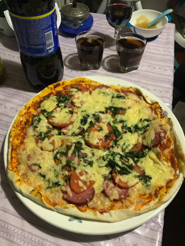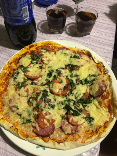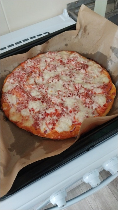 Пиццу пекла впервые, но получилось просто отлично. Очень вкусное тесто. Получилось так, как любит мой муж - тоненькое тесто и много начинки.