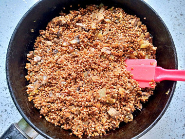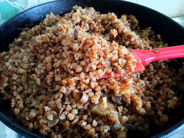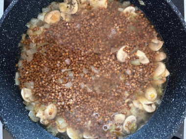 Добавьте кипяток так, чтобы вода полностью прикрывала гречку. Нагрев уменьшите, сковороду прикройте крышкой и готовьте примерно 15-20 минут (ориентируйтесь на свою плитку). После чего отключите нагрев и оставьте гречку с грибами под крышкой ещё на 10-15 минут.