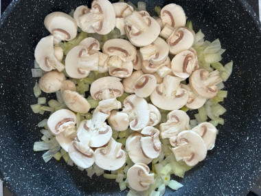 В сковороду к луку добавьте нарезанные грибы и обжаривайте на сильном огне до выпаривания жидкости (8 - 10 минут). Немного присолите грибы.