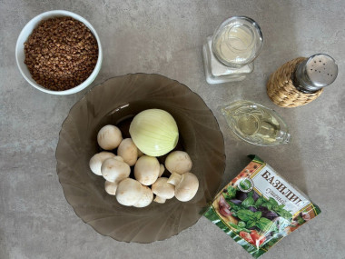Как готовить гречку с грибами и луком? Подготовьте указанные ингредиенты. В рецепте гречка готовится вместе с грибами, но вариант этого блюда можно взять на заметку и приготовить его с уже отваренной крупой. Из грибов я беру свежие шампиньоны, можно использовать замороженные, сушёные, любые лесные грибы по своему вкусу. Из специй у меня только соль и чёрный молотый перец, можно другие специи или наборы специй. Подготовьте глубокую сковороду с крышкой.