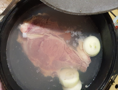Говядину (лучше возьмите мясо на косточке) залейте холодной водой, добавьте 1 луковицу и 1 морковь. Доведите до кипения на среднем огне, снимите шумовкой пену. Затем огонь убавьте и варите говядину до готовности, 1,5-2 часа, время варки зависит от размера и качества куска.