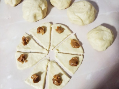Каждую часть раскатайте в круглый пласт толщиной 3-4 мм и разрежьте на 8 частей. На широкий край каждого сектора теста положите примерно по 1/3 чайной ложки вареного сгущенного молока. Скрутите тесто в форме рогалика и обмакните верх в сахар, при этом немного надавите сверху на печенье, чтобы сгущенное молоко "запечаталось" и не вытекало при выпечке.