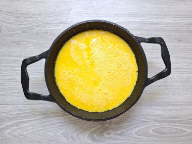 Вылейте в сковороду сладкую яичную смесь. Огонь сразу убавьте до минимального.