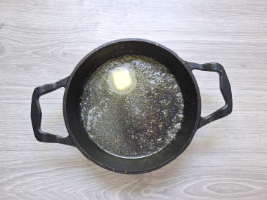 В сковороде на среднем огне разогрейте сливочное масло. В зависимости от диаметра сковороды толщина омлета будет больше или меньше. У меня диаметр сковороды 24 см. Как выбрать сковороду для жарки читайте в статье. Ссылка в конце рецепта.