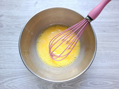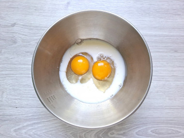 В миску разбейте яйца комнатной температуры. Если яйца мелкие, возьмите 3 штуки. Влейте молоко, всыпьте соль. Обязательно мойте яйца перед использованием, так как даже на кажущейся чистой скорлупе могут находиться вредные бактерии. Лучше всего использовать моющие средства для пищевых продуктов и щетку.
